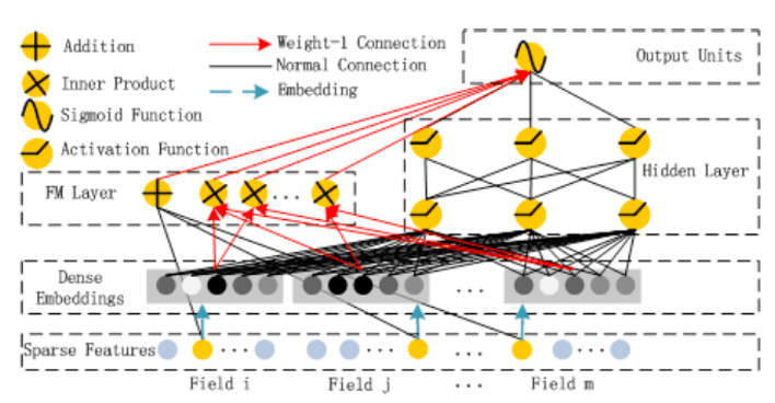 $<w, x>$부분은 linear (order-1) interaction에 해당하고, 뒷부분은 latent vector간의 내적으로 모델링한 pairwise interactions 부분이다. 주목할 점은 FM layer와 DNN layer의 임베딩을 같이 사용함으로써 임베딩 벡터가 low, high interaction에 모두 적합하도록 학습된다는 것이다.