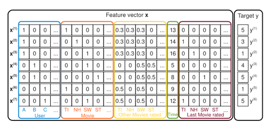 그러나 FM에서는 이와 같은 경우도 피쳐간의 interaction을 학습할 수 있다. 사용자 B가 Star Wars(SW), Star Trek(ST)를 봤을 때 비슷한 interaction을 했으므로 Star Wars의 latent vector와 Star Trek의 latent vector는 유사할 것이다.